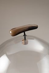 La cupola, come da antica tradizione artistica, custodisce tra le sue pareti inestimabili tesori. Nel caso del vassoio da formaggi, la cupola in vetro soffiato è essa stessa espressione della più alta qualità artigiana, che la accosta alla ricercata imponenza del corno di zebù e può essere praticamente asportata per consentirne la più adeguata delle pulizie. L'impugnatura della cloche è realizzata con un cordino in pelle che ne consente la piena flessibilità. La base, in elegante noce Canaletto, dispone di un sistema a calamita che garantisce il perfetto aggancio dei coltelli da formaggio (acquistabili singolarmente) e la loro rimozione per una funzione di presentazione degli alimenti gradevole anche alla vista e non soltanto al palato.