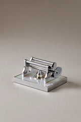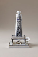 Un meccanismo tanto elegante da riuscire difficilmente ad immaginarne una collocazione nella stanza da bagno. Il misterioso oggetto in ottone cromato che poggia su di una raffinata base in madreperla australiana nasconde sotto un'enigmatica estetica la sorprendente natura della sua utilità; la rotazione dello spremi tubetto permette di beneficiare completamente della quantità di dentifricio senza sprecare prodotto. NOTA: Sebbene la madreperla sia un materiale non soggetto a CITES, per le spedizioni internazionali la dogana potrebbe approfondire con ulteriori accertamenti, influendo sui tempi di consegna.