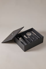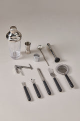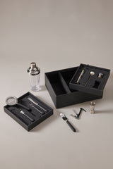 Un set non soltanto a misura di intenditore; la scatola in legno ricoperta in pelle nautica è realizzata per contenere ed ospitare sartorialmente tutti i suoi accessori, che trovano all'interno della morbida Alcantara la propria forma sagomata. Composto da cavatappi barman, pestello per zucchero, cucchiaio da cocktail, colino da bar, misurino, sbuccialimoni, coltello a tre punte, 2 decora agrumi, tappo champagne e shaker: il kit perfetto per dar vita ad un effimero momento di libidine, il rituale del cocktail.